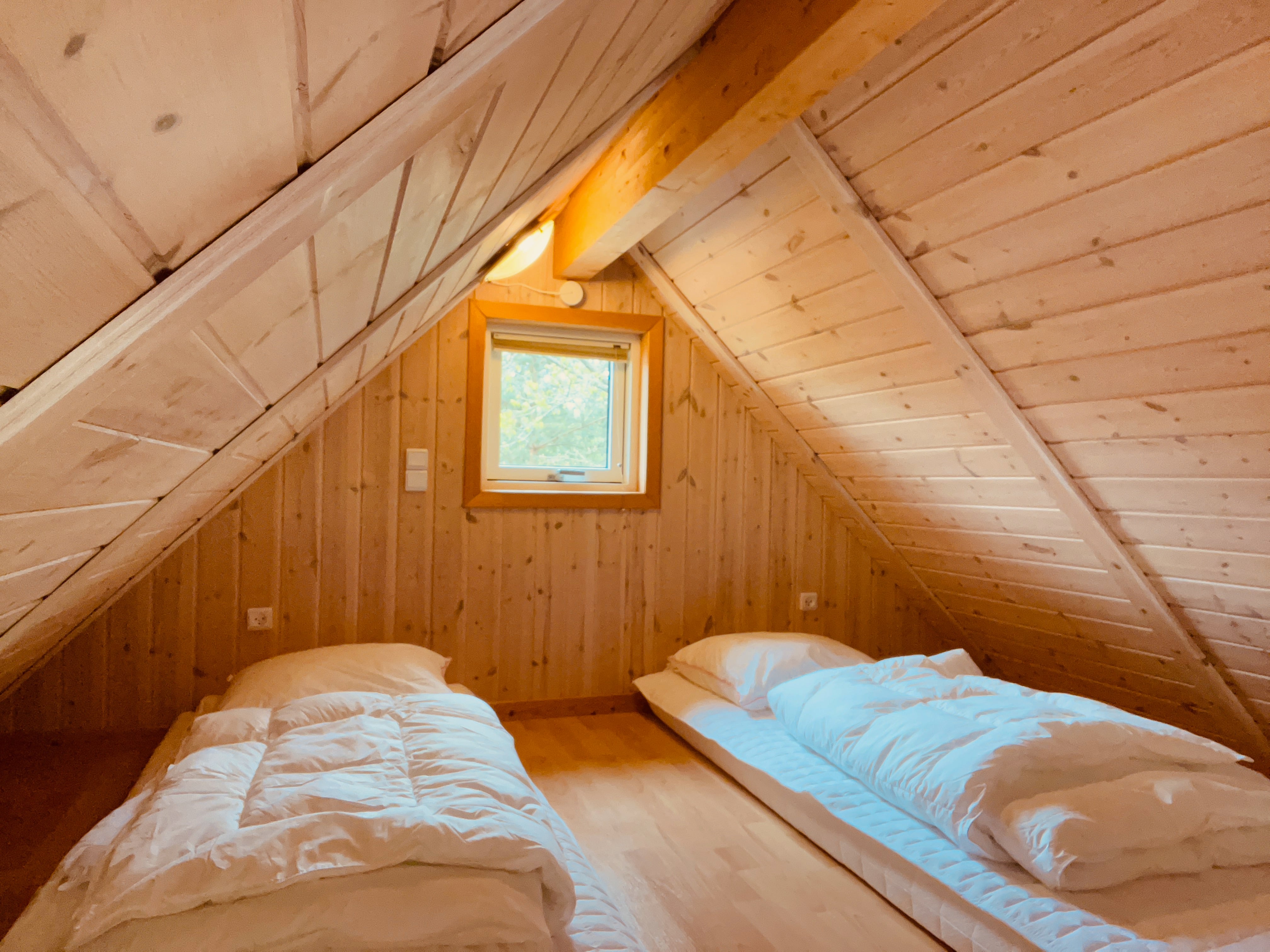 Our family cabins are designed like a 'mini cottage' with a living room including a kitchen, bathroom, a bedroom (3/4 bed), and a loft (2 single beds).